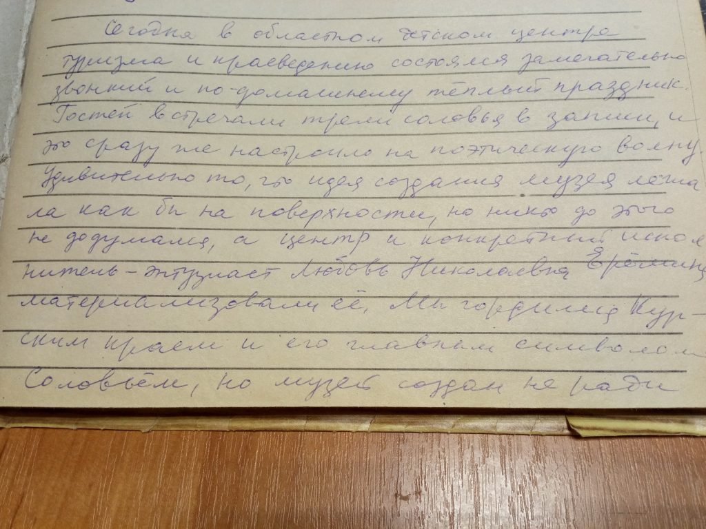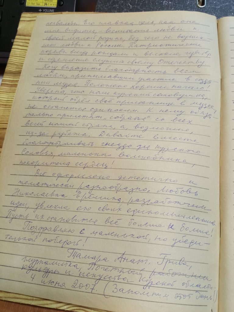 «…музей создан не ради похвальбы, его главная цель, как она мне видится, –ВОСПИТАНИЕ ЛЮБВИ К СВОЕЙ МАЛОЙ РОДИНЕ, без чего не возникнет любви к России. Патриотические порывы всегда рождали и высокие чувства, и стремление служить своему Отечеству», – записала журналист. В дальнейшем Тамара Анатольевна подарила музею брошюру о страничке «Соловушка», которую она вела почти 30 лет в областной газете «Курская правда».
